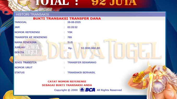 DEWATOGEL mengucapkan selamat kepada user id : LPP*** yang telah berhasil mendapatkan jackpot pada permainan SLOT DI MAHJONG WAYS 2. Kemenangan sebesar Rp 92.000.000,-. telah dibayarkan LUNAS oleh pihak dewatogel kepada pemilik user id setelah yang bersangkutan mengisi formulir withdraw. Proses pencairan dana berlangsung sangat cepat hanya dalam waktu 5-10 menit sudah berada dalam rekening pemilik user id. Bukti transfer yang dapat anda lihat adalah bukti SAH / VALID yang langsung di dapatkan melalui bukti transaksi dari Bank yang digunakan untuk pengiriman dana pada rekening pemilik user id. Terima kasih kami sampaikan kepada para pengguna setia DEWATOGEL yang telah menggunakan situs kami, sebagai Bandar Terpercaya yang pastinya membayar semua kemenangan member hingga lunas. Apakah DEWATOGEL PENIPU ? Reputasi “DEWATOGEL TERPERCAYA” sudah sangat melekat. puluhan hingga ratusan ribu pengguna setia DEWATOGEL tetap menggunakan situs terbesar dan terbaik di Indonesia ini. Hapus rasa was-was dan khawatir anda, kemenangan anda berapapun PASTI dibayarkan hingga lunas.